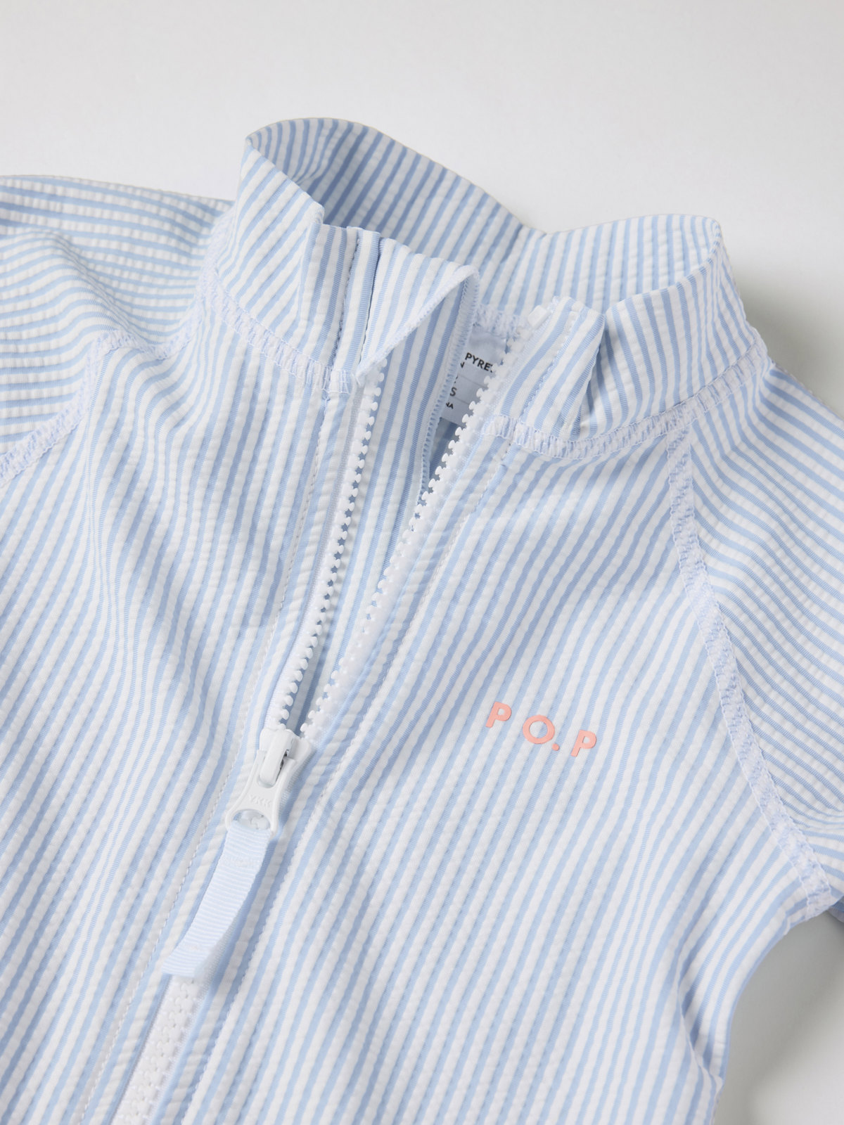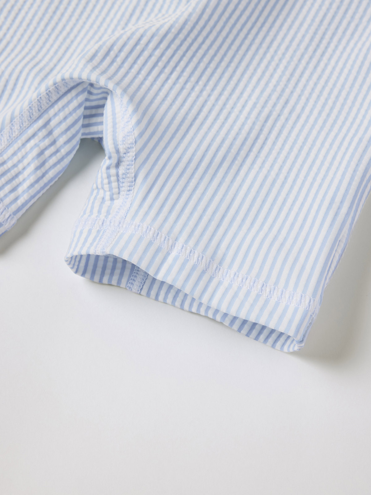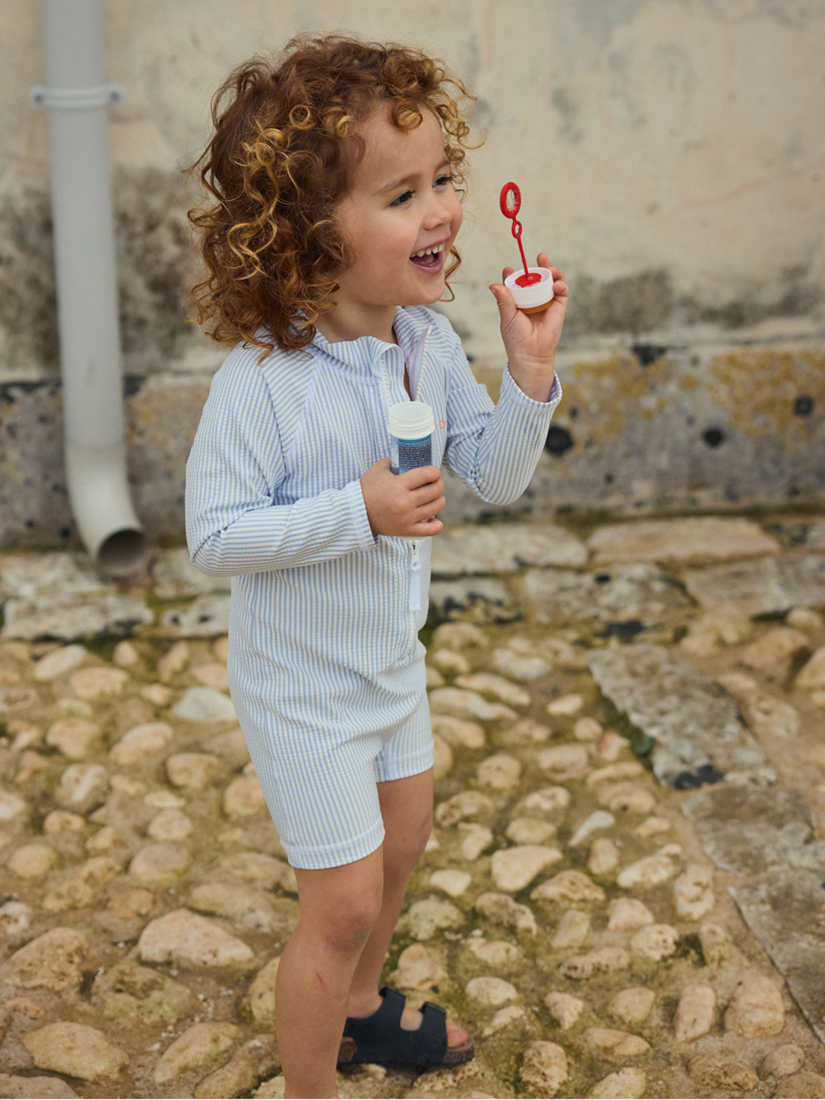 Striped long-sleeved UV suit with UPF 50 made from soft and comfy seersucker fabric, with extra soft seams that are gentle on the skin. The neck-to-ankle zipper makes dressing easy, and the chin guard is gentle on the chin and cheeks.