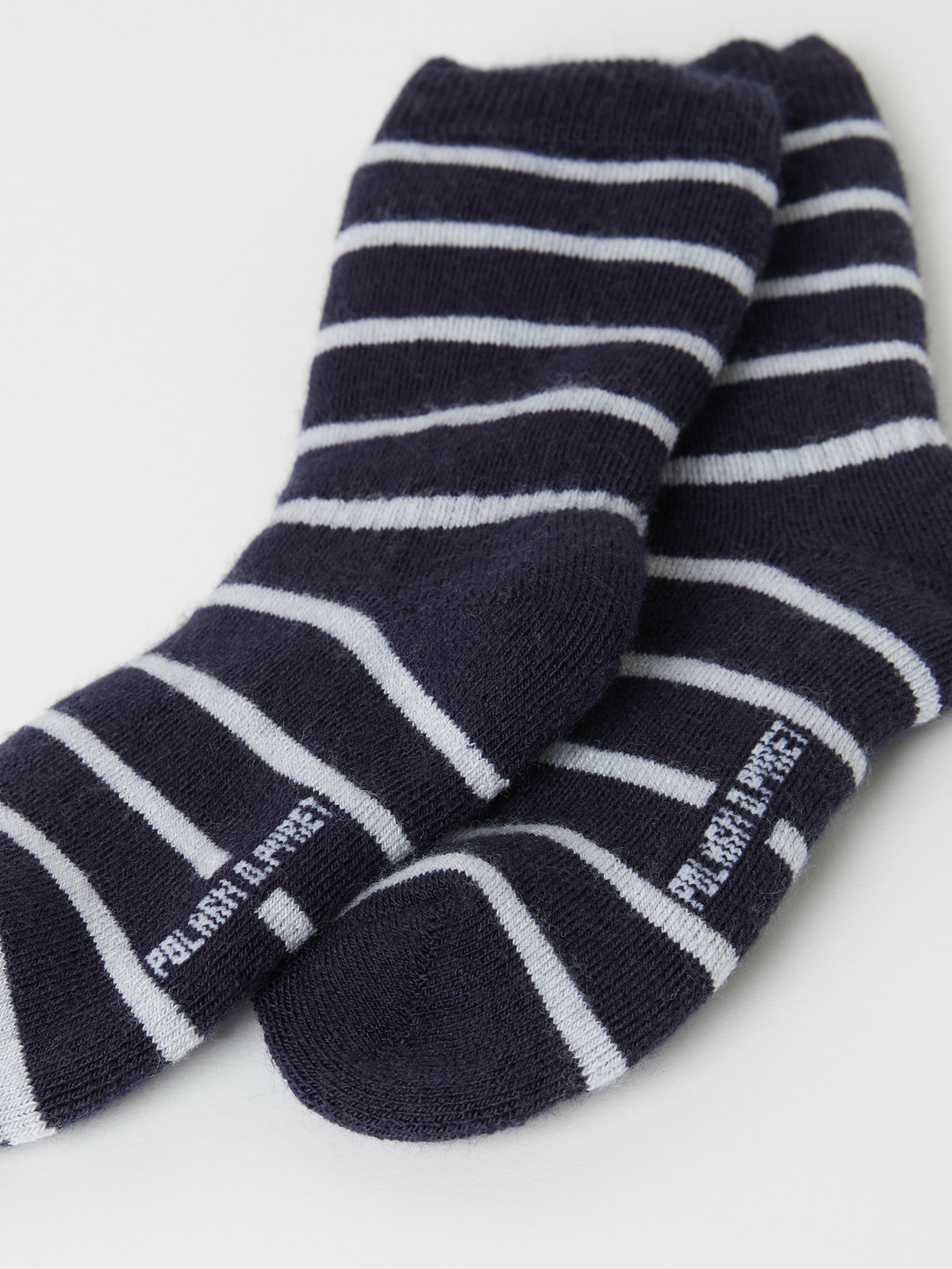 A pair of striped socks in soft wool terry that keeps little feet warm. The socks feature our classic stripes. The size is indicated on the arches. There is also space to write your child's name. So it's easy to keep things in order!