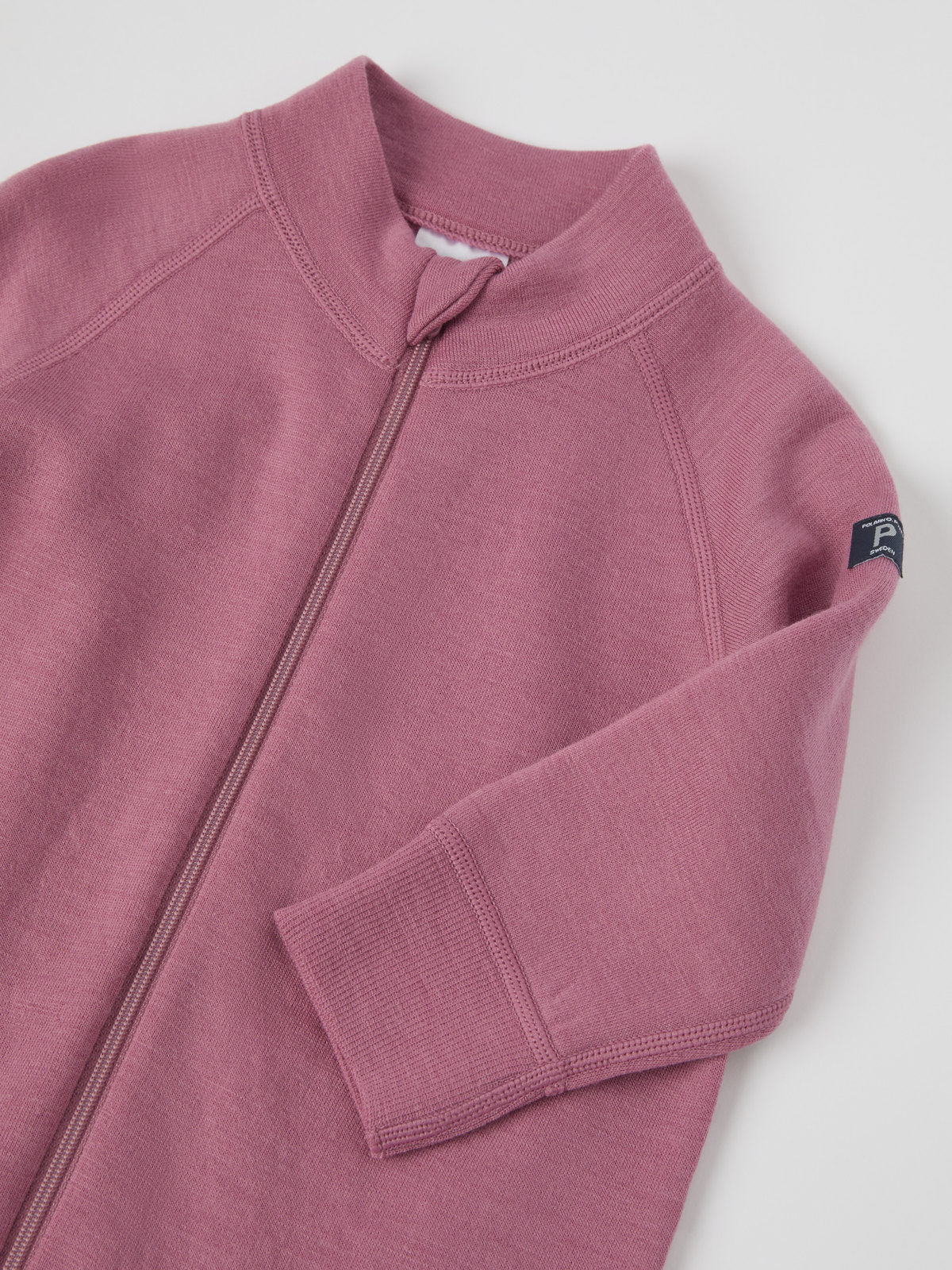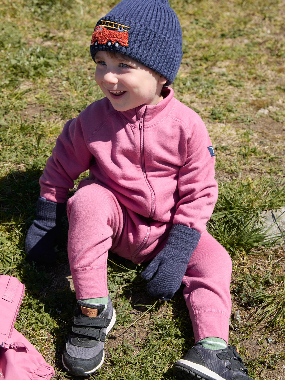 A warm all-in-one in soft and comfy merino wool terry that absorbs moisture, keeping the child warm and dry.