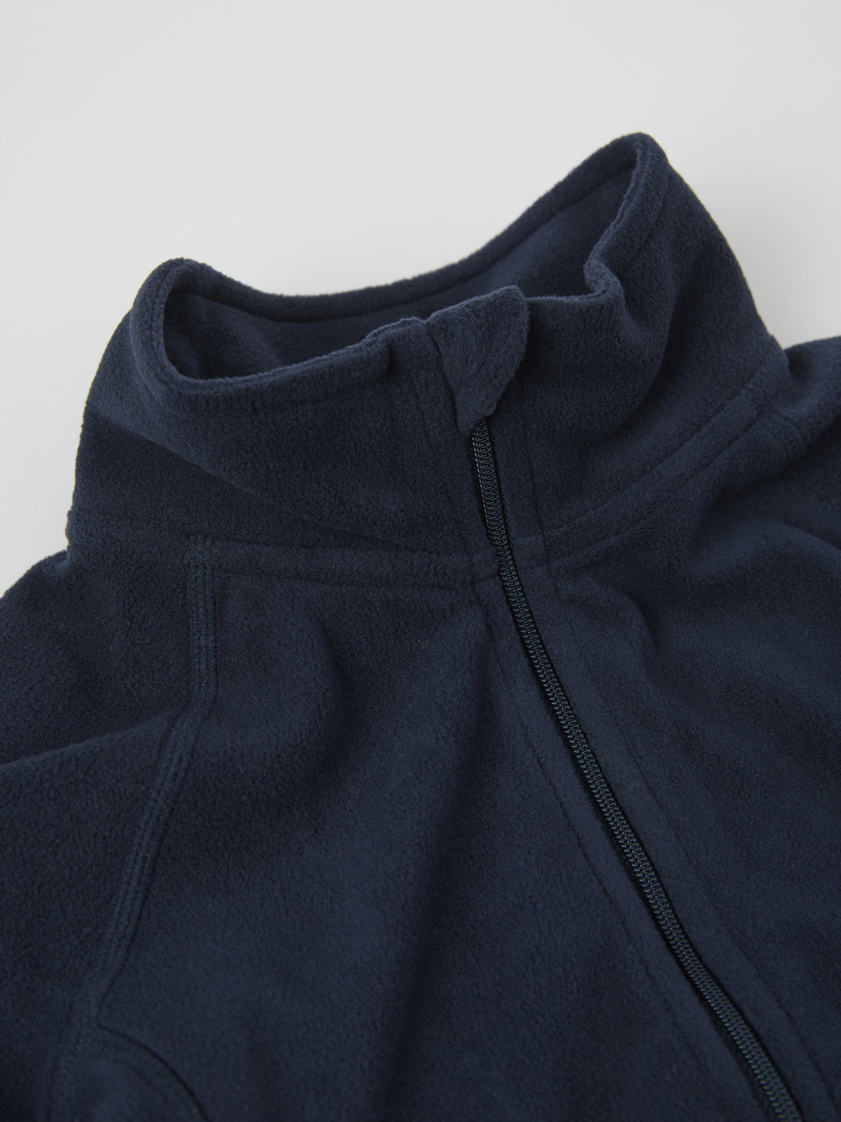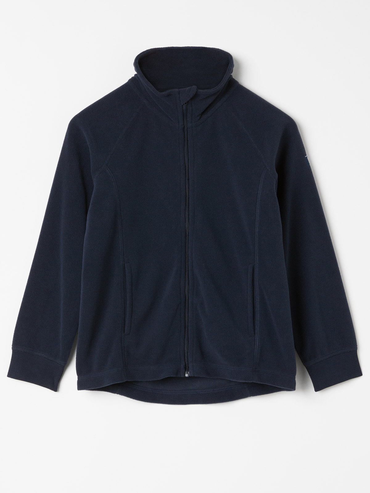 A jacket in soft and comfy fleece with side pockets and elastic cuffs. The jacket is made of recycled polyester, which wicks moisture, keeping the child warm and dry. The zipper has a chin guard that is gentle on the chin and cheeks.