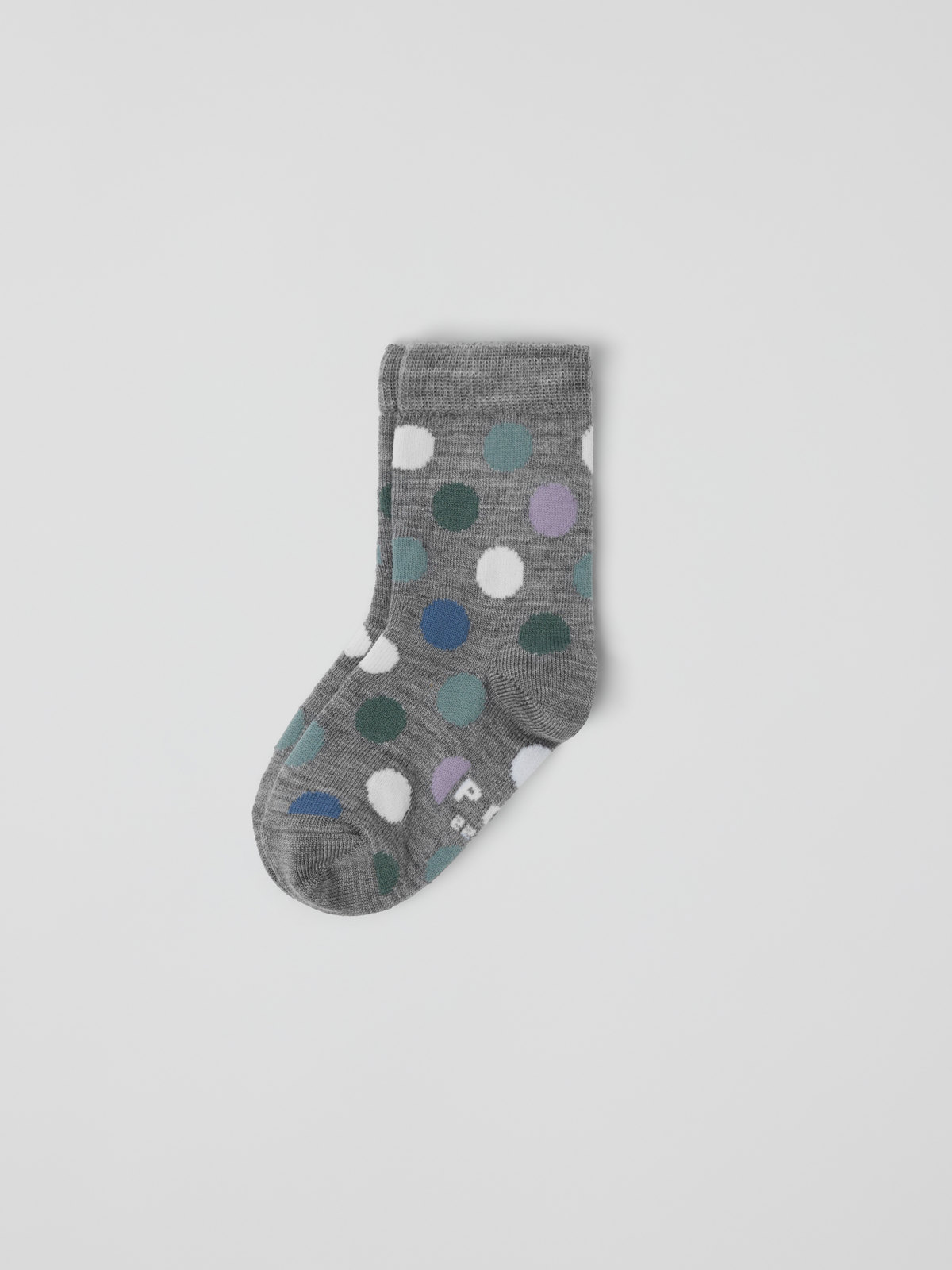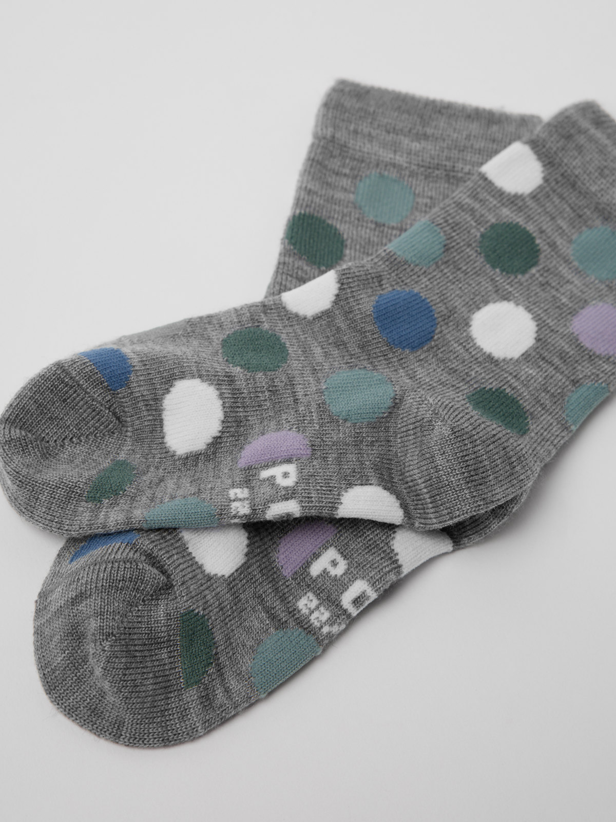 A pair of polka dot socks in thin merino wool that feel nice and soft on little feet. The size is indicated on the arches. You can also write your child’s name on them so it’s easy to keep things in order!
