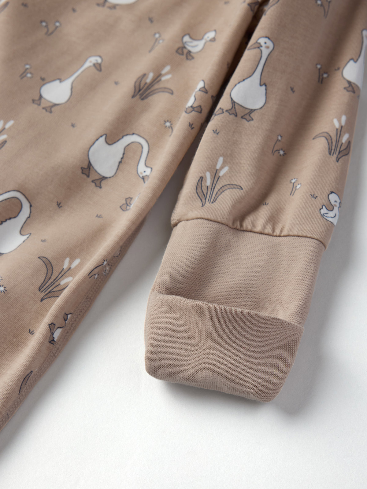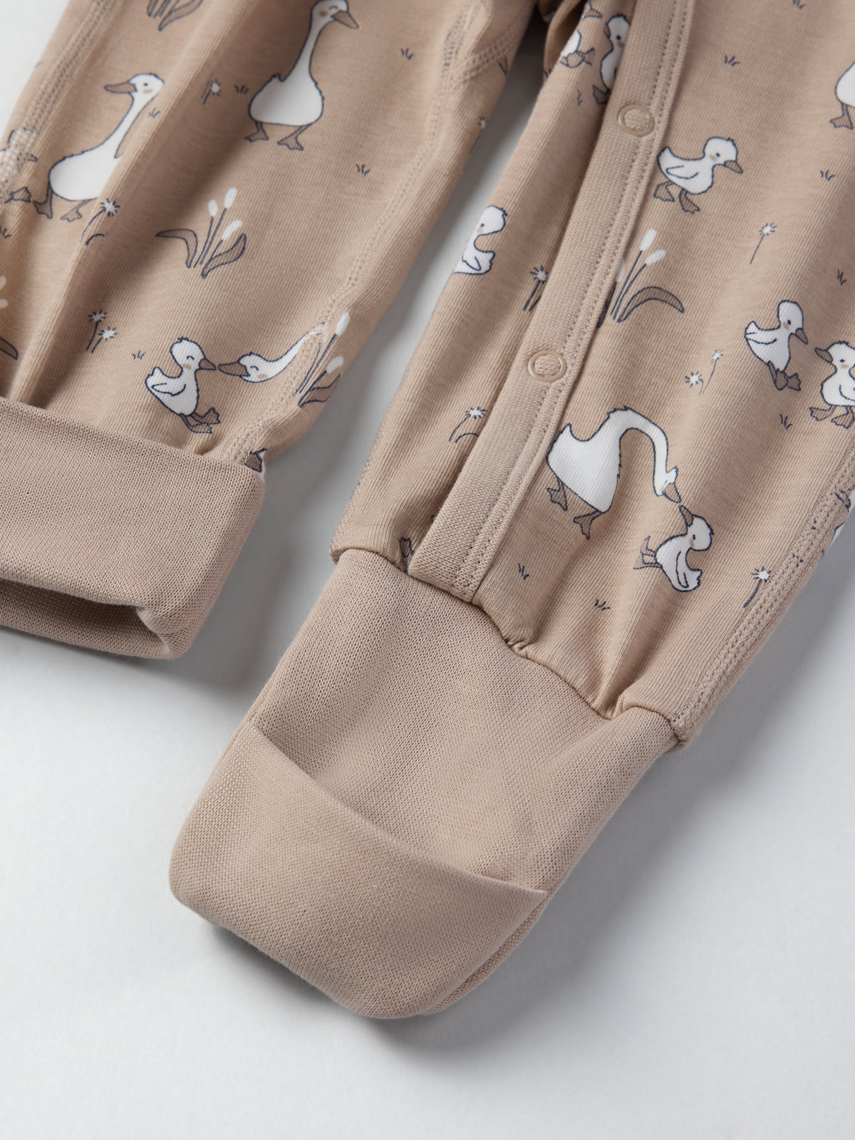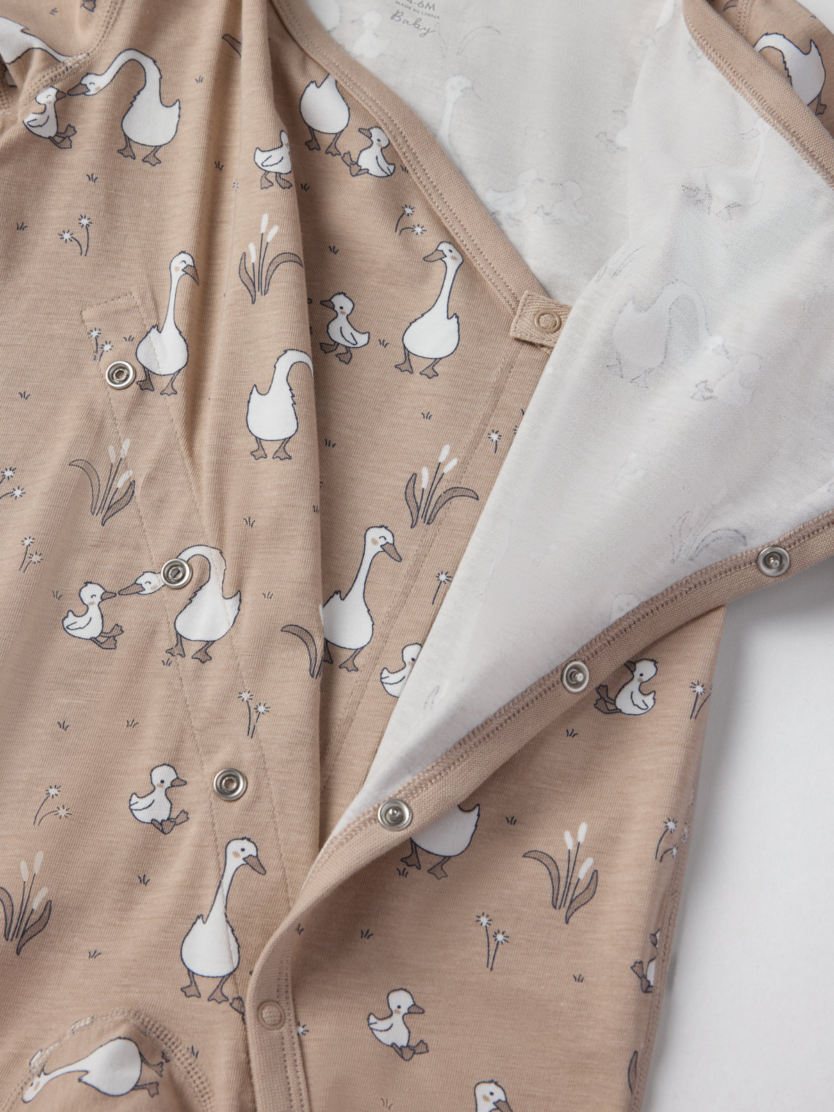 The onesie features an allover goose print and a pretty ribbon under the sleeves that can be tied in a bow.