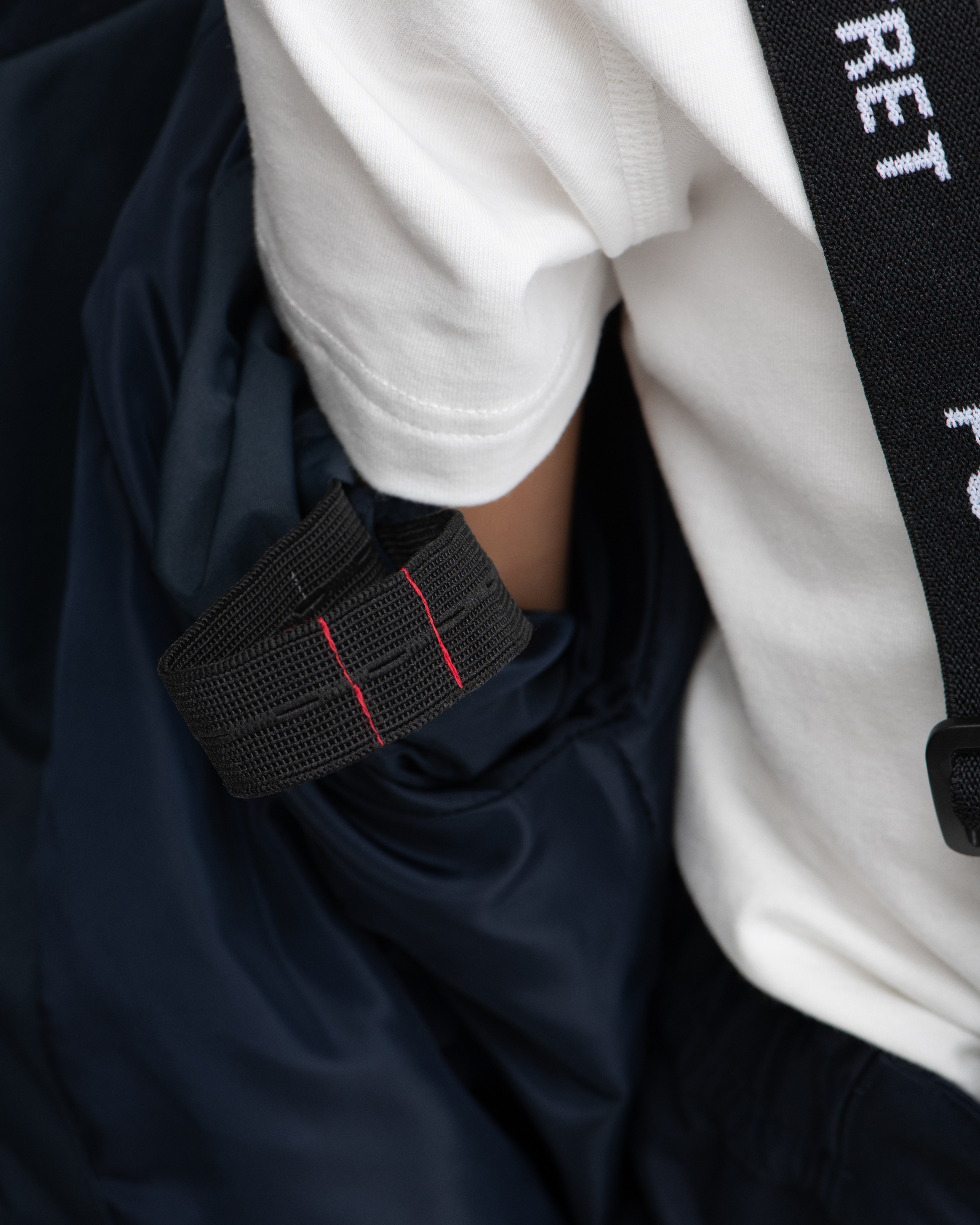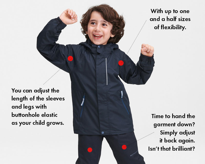 - The adjustments are concealed in a small pocket inside the sleeves and legs to avoid any risk of snagging when your child puts on or takes off the garment.