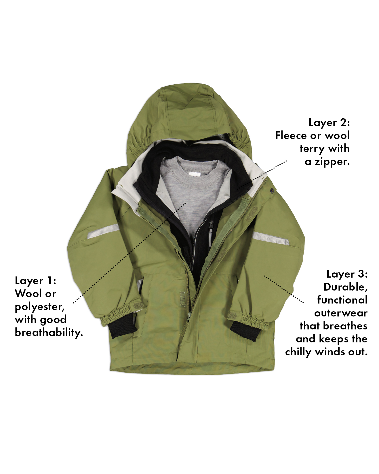 The thickness of this garment can vary depending how cold and windy it is and your child’s activity level. You can use several garments as a middle layer and remove them as necessary. So make sure this garment has a zip or other opening that makes it easy for your child to open and remove.