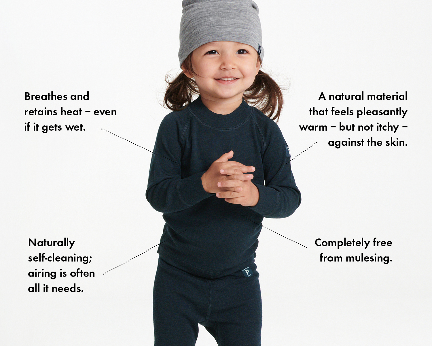 The solution is a material that keeps their body warm and dry. This is why we recommend a wool base layer. Wool is nature’s super material, as it breathes and keeps the body really warm – even if it gets wet. Wool is also especially good for newborn babies and infants, who haven’t yet developed the same ability to regulate their body temperature as older children and adults.