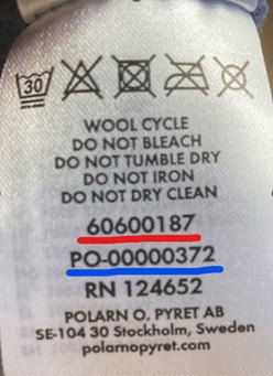 The PO-number and Article number can be found on the second page of the Care label inside the garment.